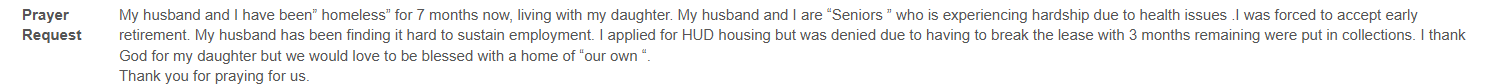 “My husband and I have been ‘homeless’ for 7 months now, living with my daughter. My husband and I are seniors experiencing hardship due to health issues. I was forced to accept early retirement. My husband has been finding it hard to sustain employment. I applied for HUD housing but was denied because of a broken lease with 3 months remaining that was sent to collections. I thank God for my daughter but we would love to be blessed with a home of our own. Thank you for praying for us.”